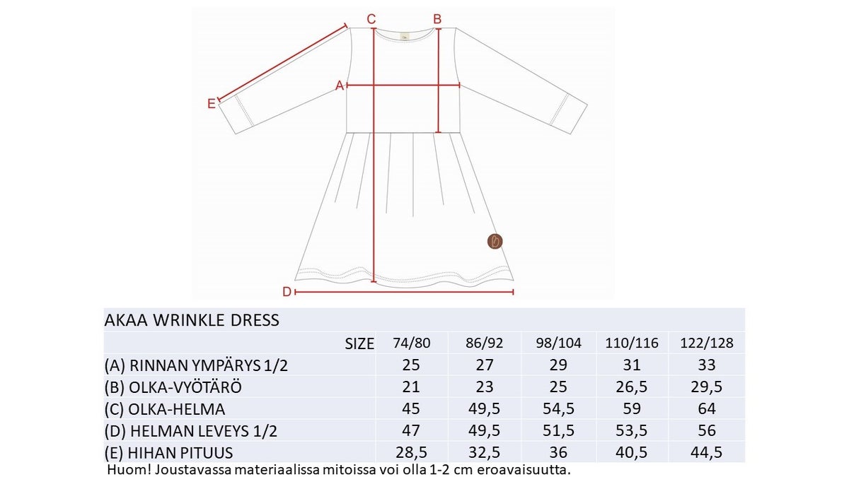 Akaa mekko on ihanan pehmeää puuvillaelastaanitrikoota ja siinä on taskut sivusaumoissa. Valitse tuotteesta lapsen pituutta lähinnä oleva koko. Tuote kutistuu maksimissaan 5 %. Pesu 40 asteessa.
